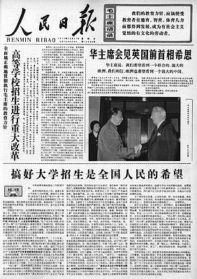 1977年10月21日,《人民日报》在头版位置刊发了新华社消息《高等学校招生进行重大改革》,消息称:“录取学生时,将优先保证重点院校、医学院校、师范院校和农业院校,将分别注意招收表现好的赤脚医生、民办教师和农业科技知识分子。将注意招收少数民族学生,并注意招收一定数量的台湾省籍青年、港澳青年和归国华侨青年。”