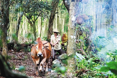 竹林旁、广场前,村民三两闲坐,热情好客。他们剖开一个香甜的菠萝蜜,与来客分享,再聊聊你家的娃,谈谈我家的牛,不慌不忙。农田里,牵牛的缰绳勒破了农夫的衣衫,犁地时的深一脚浅一脚,是生活的重量。