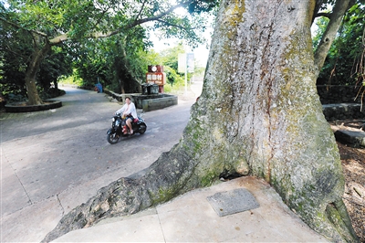 村东门旁,一棵树有两个生命,见血封喉树与榕树寄生生长,巨冠如盖。村民们说,这棵寄生在见血封喉树上的榕树,是飞鸟衔来的种子,在此生根发芽,与见血封喉树合二为一。两棵枝干连接,难分你我,甚是多情,堪称奇观。