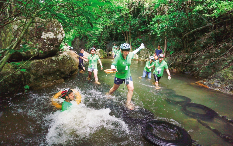 6月4日,游客在保亭呀诺达雨林文化旅游区参与踏瀑戏水拓展项目,欢乐消暑度假。