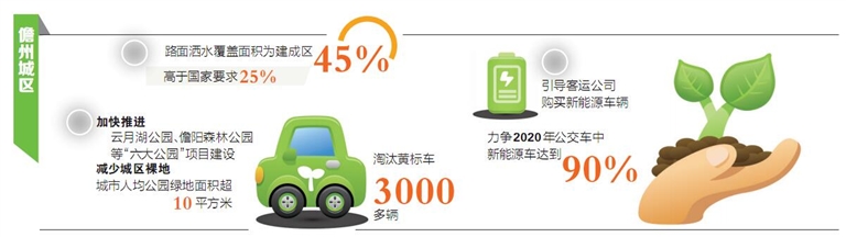 大气污染防治专项行动成效显著。城市扬尘污染防治,全面监控全市在建工程,减少工地扬尘污染;城区路面洒水覆盖面积为建成区45%,高于国家要求25%;加快推进云月湖公园、儋阳森林公园等“六大公园”项目建设,减少城区裸地,城市人均公园绿地面积超10平方米。机动车尾气污染防治有效开展,淘汰黄标车3000多辆;引导客运公司购买新能源车辆,力争2020年公交车中新能源车达到90%。工业污染治理加大力度,淘汰燃煤小锅炉,6家企业燃煤锅炉技改生物质燃料;全市36家民营加油站完成油气回收工作。