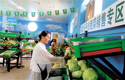 6月2日,市民在位于海口市秀英区港爱路菜篮子平价超市选购蔬菜。这是海口市菜篮子集团设立的第二家“菜篮子”平价超市,于两周前开业。店内目前供应蔬菜60多种,水果20多种,单品供应达3000个。住在周边小区的居民出门5分钟就能买到安全菜、放心菜、便宜菜。
