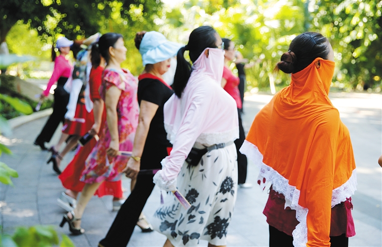 | 6月6日,十几名妇女“全副武装”,在海口市人民公园练习舞步。本报记者 苏晓杰 摄 |