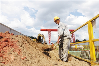 | 6月5日,海口椰海大道施工现场,工人们挥汗如雨。本报记者 王凯 摄 |