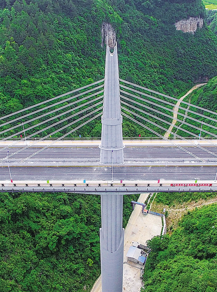俯瞰干沟大桥呈现“芦笙”造型的主桥墩。 6月6日,由中铁五局承建的贵州省黔南布依族苗族自治州龙里县干沟大桥顺利竣工。该桥长285米,主塔高137米,大桥主桥墩以民族乐器“芦笙”为原型建造,造型优美。 新华社记者 刘续 摄