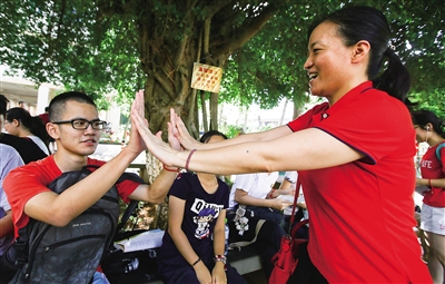 6月7日,高考首日,海南中学初中部考点,老师和考生一一击掌,为学生加油鼓劲。