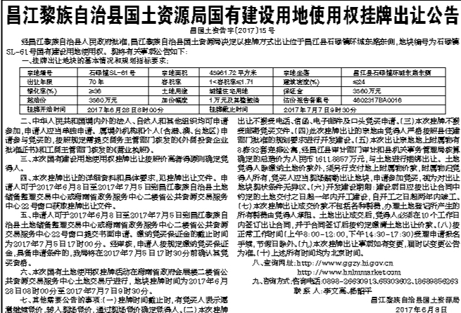 昌江黎族自治县国土资源局国有建设用地使用权挂牌出让公告