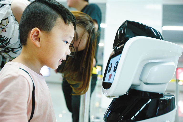 6月7日,在宁波轨道交通1号线樱花公园站,一名小朋友和机器人“小轨”对话。 当日,一款智能服务机器人亮相宁波轨道交通1号线。这款机器人名叫“小轨”,可以为乘客提供票价咨询、首末班车时间表、地铁站卫生间及无障碍电梯位置查询等服务,还能够实现人脸识别并主动与乘客打招呼。 新华社发