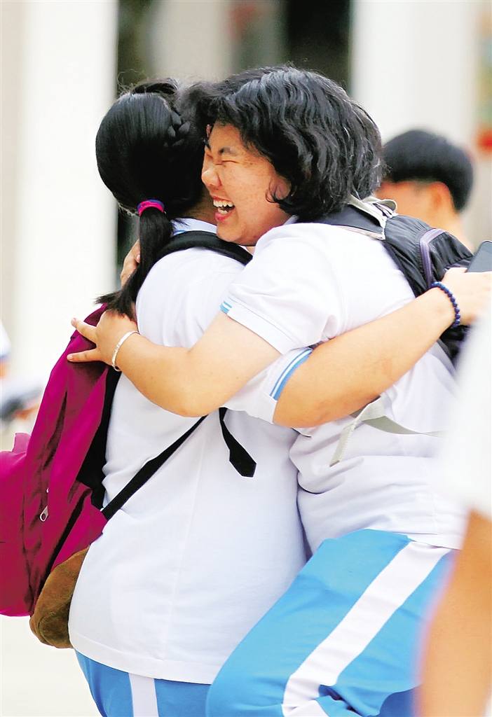 6月9日,在海口市第一中学高中部考点,考生们在高考最后一门科目结束后互相拥抱。