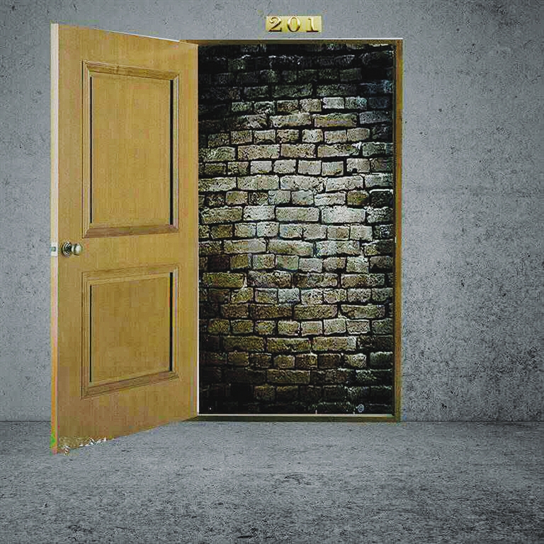 李博有一幅作品,描述了这样的场景:打开一扇门,却发现屋子里装满了砖头,没有丝毫的立足之地。如果说,置身于玻璃杯的虫子,只是找不到出路,还能看到光明;那么李博的作品则彻底地表达了某种无奈。