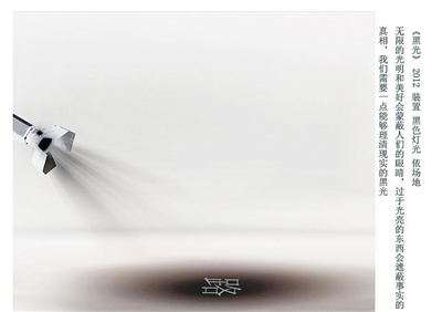 “现在明星包装得很好,这是我们看得到的,但也有我们看不到的、没有包装的那部分。”在作品《黑光》中,他试图提醒那些当局者警惕太过完美的人与物,投出一抹理性之光。“无限的光明和美好会蒙蔽人们的眼睛,过于光亮的东西会遮蔽事实的真相,我们需要一点能够理清现实的黑光。”