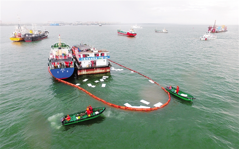 当天下午15时10分,演习正式开始。此次演习全程采取无脚本模式进行,模拟一艘船舶在过驳作业期间由于管路阀门爆裂造成大面积油污污染。事故发生后,该轮展开自救并向洋浦海事局报告险情,海事局随即启动了《洋浦海事局船舶污染突发事件应急预案》。考虑到现场突发的雷雨天气对溢油事故可能产生的影响,现场指挥人员当即调动了两艘海巡船艇前往事发水域进行警戒,并协调辖区清污力量进行溢油围控、溢油回收,消油剂喷洒等行动。经过紧张的拦截、清污行动,此次溢油得到了有效清除,演习圆满结束。