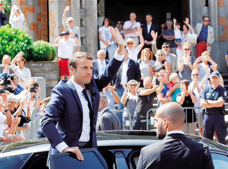 | 6月11日,马克龙参加国民议会选举首轮投票后向民众致意。新华社/美联 |