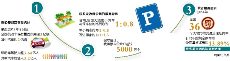 保守估计,目前我国停车位缺口超过5000万个。统计数据显示,2014年,全国36个大城市的交通违法处罚中,针对不按规定停车的处罚量占比高达13.89%,居各类交通违法处罚之首。