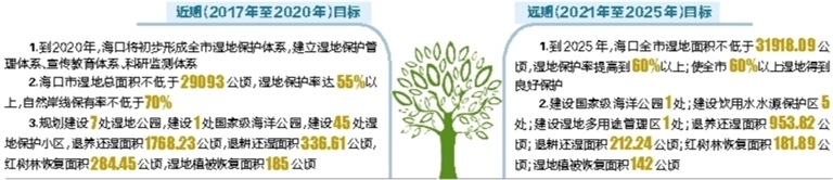 在远期建设目标中,到2025年,海口全市湿地面积不低于31918.09公顷,其中,滨海湿地保护面积不低于8000公顷,新增湿地面积2825公顷(含退耕还湿),湿地保护率提高到60%以上;使全市60%以上湿地得到良好保护,湿地污染得到有效解决,退化湿地生态功能恢复效果明显,湿地修复面积大大提高。