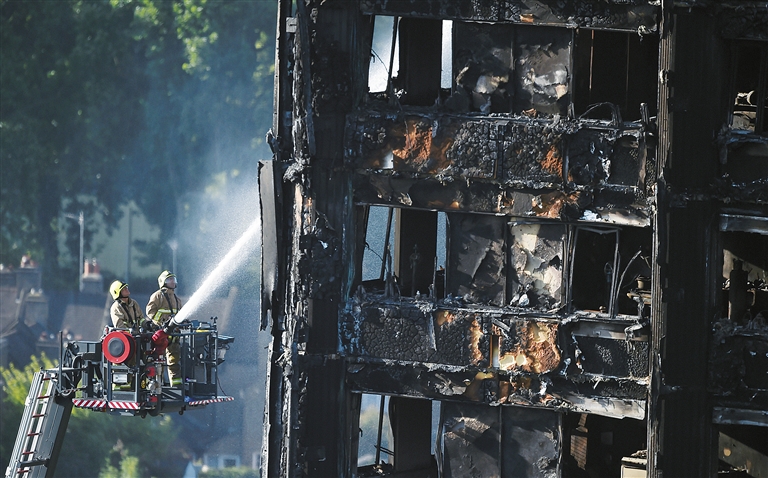 6月16日,消防员在英国伦敦居民楼火灾发生地工作。 英国警方16日说,日前发生的伦敦高层居民楼火灾已造成30人死亡,死亡人数有可能进一步上升。 新华社/路透