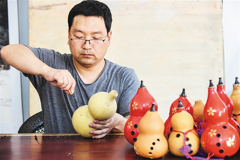 6月16日,张志远在制作“福禄笙”。 张志远是河北饶阳县一名普通职工,从小对音乐很感兴趣,并制作了一款新乐器:外观是民族传统的宝葫芦造型,发音依靠簧片,并融合竹木发音管的音色。他将这款新乐器叫做新型匏笛,又名“福禄笙”,并获得国家专利。其特点是音高固定,容易掌握,很适合对音高没有基本概念的青少年学习。新华社记者 李晓果 摄