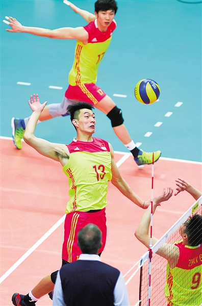 6月17日,在江苏省昆山市举办的2017年世界男排联赛(昆山站)比赛中,中国队以3:1战胜澳大利亚队。图为中国队球员陈龙海(前左)在比赛中进攻。 新华社发