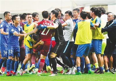 无独有偶,北京国安与天津泰达的“京津德比”场面也很火爆。上半场结束前,两队球员发生冲突,李磊、潘喜明、买提江各吃到一张黄牌,其中泰达球员买提江两黄变一红被罚下。