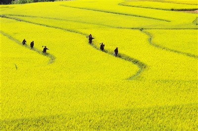 站在仿古栈道上,可以看到一大片稻田地。进入六月,金黄色的稻田随风舞动,寓意着丰收喜悦。