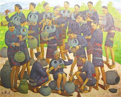 “刚刚有参展的观众说,我画的黎族姑娘不够漂亮。我告诉他,我画的不是电影明星,我画的是我印象中热爱的黎族同胞。”黎族画家王雄此次展出的作品为《秋天的节拍》《唱响春天的歌》《锦花尽在黎山村》等,他表示,这些作品以线条为主,用壁画结合油画的手法,色彩单纯、不夸张,没有过分渲染,体现黎族人民的淳朴。在《唱响春天的歌》里,画的是黎族人在过年的时候喝酒对歌的热闹场面。一位年轻的身着筒裙的黎族姑娘正在给一位纹脸的老阿婆倒酒,他们身后围着姿态各异、欢畅喝酒的人们。