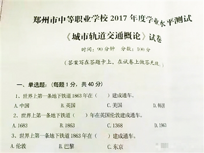 郑州市教育局工作人员表示,本次城市轨道专业试卷的命题工作,由郑州市职业技术教育教研室委托参与测试学校的老师进行,由于命题老师责任心不强、郑州市职业技术教育教研室审核把关不严,导致试卷中出现“雷人”命题,严重影响了郑州职业教育形象,造成了不良社会影响。