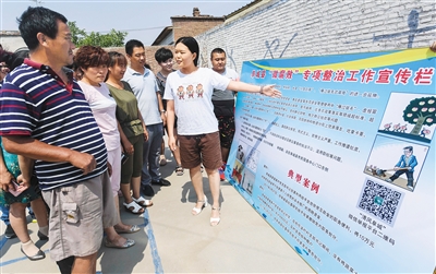 6月18日,阜城县纪检监察干部在三里铺村向村民讲解身边的“微腐败”案例。 为推进“一问责八清理”和基层“微腐败”专项治理工作开展,河北省阜城县纪委督促各级党委履行好党风廉政建设责任,采取张贴二维码举报牌、开展宣讲、走访群众等形式,引导群众积极参与监督,拓展监督渠道和载体。 新华社发