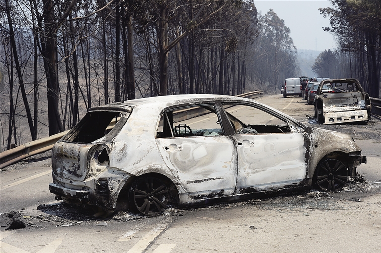 这是6月18日在葡萄牙中部大佩德罗冈地区拍摄的被森林大火烧毁的汽车。 根据葡萄牙内政部提供的最新数据,截至当地时间18日19时,葡中部地区森林火灾已造成至少61人死亡、57人受伤。葡萄牙政府已宣布国家进入紧急状态,并从18日开始举行为期3天的全国哀悼。此次森林大火开始于当地时间17日15时左右,随后迅速向四方蔓延,酿成重大火灾。目前消防员们仍在灾区灭火。 新华社发