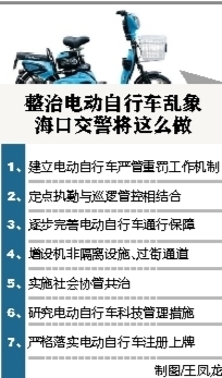 据悉,针对电动自行车交通乱象问题,海口公安交警支队将采取以下解决措施:一是结合公安部关于“三驾三乱两闯”交通大整治工作部署,将电动自行车纳入为期半年的整治当中,建立电动自行车严管重罚工作机制,视违法情节轻重、危害后果大小等要素严格执法,严厉处罚;二是研究完善勤务执勤执法管理模式,采取定点执勤与巡逻管控相结合方式,实行网格化责任挂钩制度;三是立即摸排电动自行车通行条件现状,逐步完善电动自行车通行保障;四是增设机非隔离设施、过街通道,进一步优化交通组织,规范电动自行车通行秩序;五是拓展“执法+媒体+N”,着力形成“多部门联动机制”,实施社会协管共治,公开曝光交通违法行为,;六是研究电动自行车科技管理措施,如用非现场方式抓拍电动自行车交通违法行为,通过监控抓拍手段弥补无警状态下失管失控的缺陷,确保路段、路口全天候管控;七是严格落实电动自行车注册上牌管理工作措施,强化电动自行车注册服务力度,有效解决电动自行车上牌注册的条件。