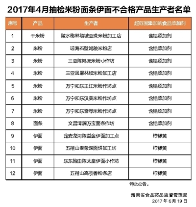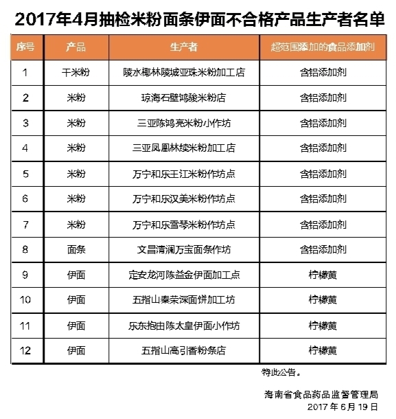 今年“五一”节前,再次开展的覆盖全省、同一时间、不打招呼、直奔现场的排查抽检行动,共抽检了全省642家米粉面条伊面生产企业、小作坊738批样品,只有12批不合格,不合格率降至1.6%,其中未发现添加硼砂等非食用物质的现象,海南人民群众可以吃上放心安全的米粉面条伊面了。为震慑违法生产行为,现将不合格产品生产者名单予以曝光。