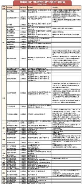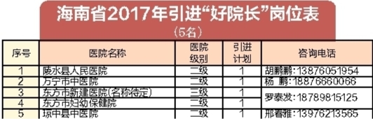 2017年海南省计划面向全国刚性引进“好院长”5名、“好医生”100名(见附件1、2)。柔性引进不定岗位,先报名经审核合格后再推荐聘用。