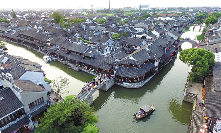 春秋的水,唐宋的镇,明清的建筑,现代的人……乘一叶扁舟,悠然穿过嘉善西塘古镇的桥洞,远处是大红灯笼高挂的热闹街市,近旁是岸边躺椅上品茶的老翁。