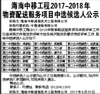海南中移工程2017-2018年物资配送服务项目中选候选人公示