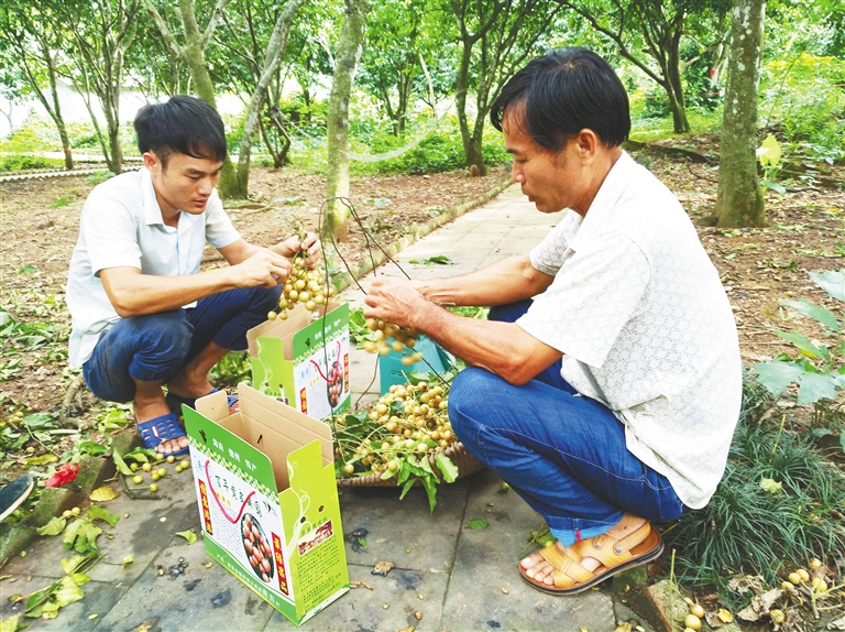 “我要买两箱黄皮带去北京送朋友,麻烦今天帮我装好。”一位福建老板在电话里向符在明下了单。接到订单后,符在明立马招呼儿子给客户采摘黄皮,因为成熟的黄皮仅占少数,符在明的儿子穿梭在好几棵黄皮树之间才摘了一箩筐黄皮。精心挑选,将不合格的全部剔除,适当地留下一些枝叶保鲜。“我要把最好的黄皮采摘下来给游客,绝不能让游客吃到未成熟的黄皮,坏了南吉黄皮的好名声。”符在明的儿子说。
