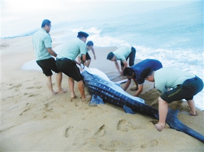 据了解,鲸鲨属国家二级保护动物。6月20日18时29分,黎安边防派出所接到群众举报称:在黎安边防辖区后海坡海滩发现一只搁浅鲸鲨,请求救助。接警后,该所迅速出动6名警力,带上相关救援装备立即奔赴现场救援。