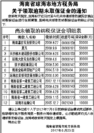 海南省琼海市地方税务局关于领取逾期未取保证金的通知