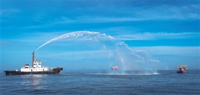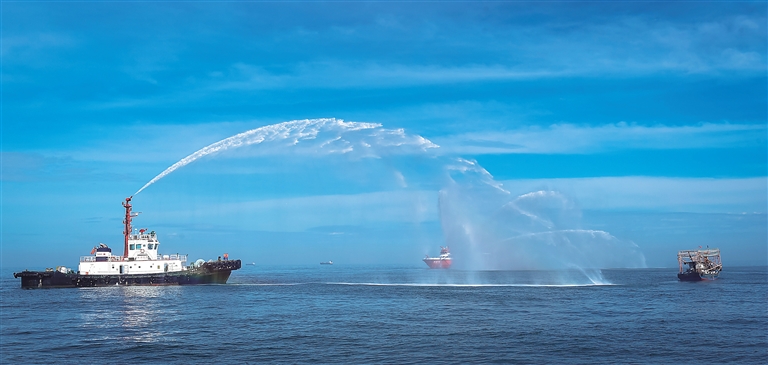 6月22日,洋浦海上搜救分中心在洋浦10号锚地附近水域组织开展海上消防、救生以及商渔船碰撞应急处置演习。图为演习现场。