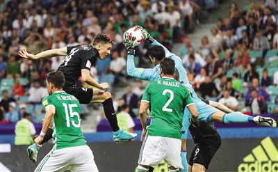 6月22日,在索契举行的俄罗斯联合会杯足球赛A组小组赛中,墨西哥队以2:1战胜新西兰队。
