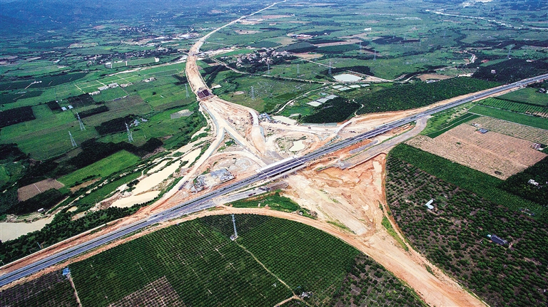 6月21日,位于乐东黎族自治县利国镇以东的琼乐高速公路项目终点,与环岛西线高速公路相接的互通立交雏形显现。琼乐高速公路项目作为我省“田字型”主骨架高速公路网的重要组成部分,全长约128.8公里,全线采用双向四车道高速公路标准建设,设计速度100公里/小时,项目估算总投资为113.93亿元。本报记者 张杰 摄