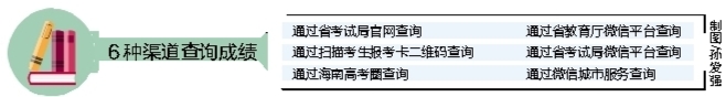 记者了解到,今年考生可以通过6种渠道查询成绩:一是通过省考试局官网查询;二是通过扫描考生报考卡二维码查询;三是通过海南高考圈查询;四是通过省教育厅微信平台查询;五是通过省考试局微信平台查询;六是通过微信城市服务查询。