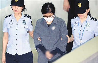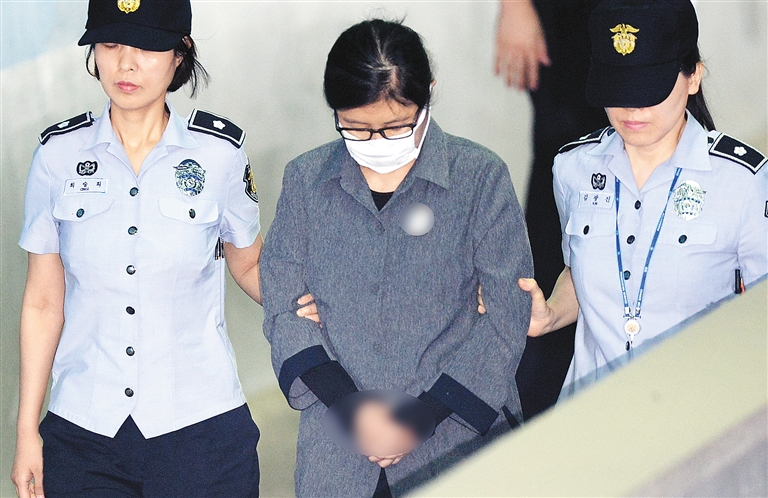 6月23日,崔顺实(中)抵达韩国首尔中央地方法院参加宣判。 韩国首尔中央地方法院23日就“亲信干政”核心人物崔顺实的女儿郑某入学韩国名校梨花女子大学舞弊案进行宣判,崔顺实以妨碍公务罪等罪名被判处3年监禁。
