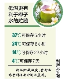 目前,国内外对开壳后的椰子水在自然条件下贮藏时间研究很少。赵松林等人结合我省四季温度变化,研究在不同温度下贮藏时椰子水品质自然变化的特点。结果表明,低温更有利于椰子水的贮藏;相同贮藏温度,密封和非密封保存时间无差别,37℃可保存5小时,24℃可保存8小时,14℃可保存22小时,4℃可保存7天。