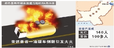有目击者说,事故发生在当地时间25日早6时30分左右,一辆油罐车因爆胎侧翻后,引发附近许多民众乘摩托车前去围观,并争相收集油罐车泄漏出来的油料,随后油罐车突然燃起大火,导致大量人员伤亡。