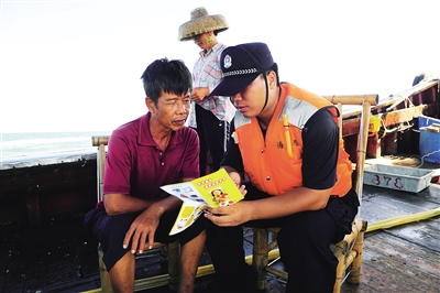 6月23日,海南海警二支队官兵在三亚湾附近海域开展海上巡检、普法宣传等国际禁毒日主题宣传活动,对渔民、海上游客进行预防教育。
