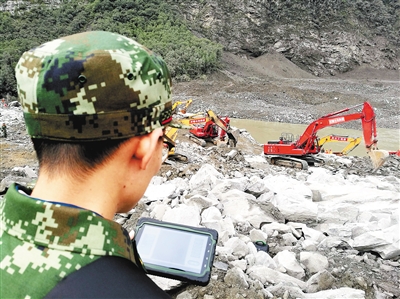 6月25日,武警水电部队官兵利用国内最先进的雷达生命探测仪抓紧搜救。 四川省茂县“6·24”叠溪山体滑坡后,武警水电部队紧急调集精锐救援力量,多路出击赶赴现场展开救援工作。截至25日9时,已有580名官兵、183台大型救援装备到达核心区展开救援。