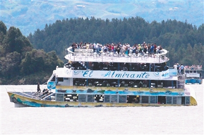 这是6月25日在哥伦比亚安蒂奥基亚省瓜塔佩市的一个水库拍摄的正在下沉的游船。 一艘载有150人左右的游船25日在哥伦比亚西北部安蒂奥基亚省瓜塔佩市的一个水库沉没。据当地防灾部门确认,该沉船事件已造成至少9人死亡,另有约28人失踪。 新华社/法新