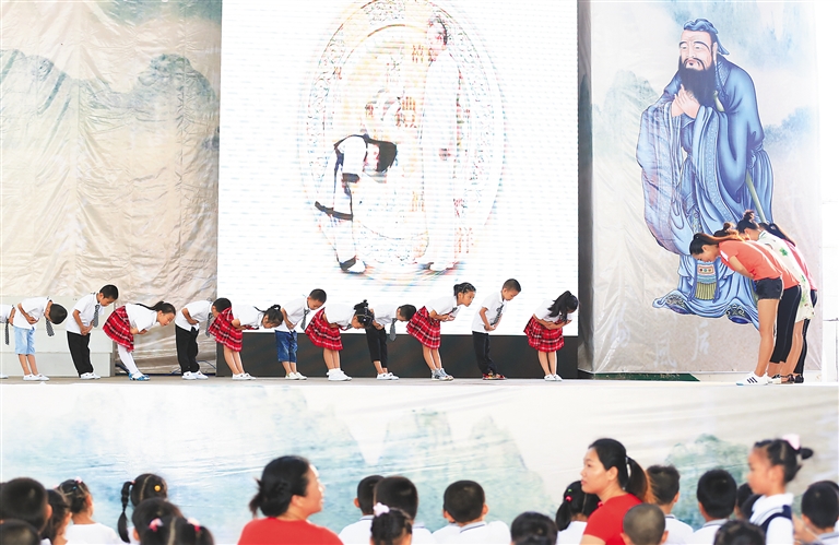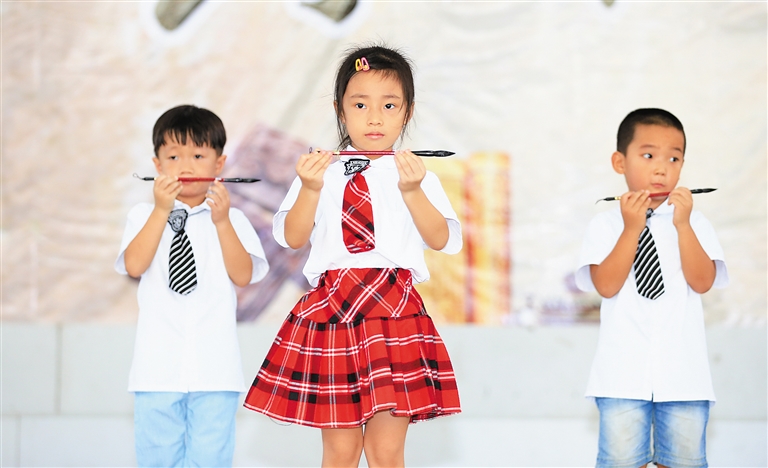 孩子们手握毛笔写下人生第一个字“人”。 本报记者 张杰 摄