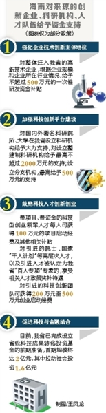 最新出台的《中共海南省委海南省人民政府关于加快科技创新的实施意见》,围绕全面落实中央关于深化科技体制改革、加快实施创新驱动发展的决策部署,从指导思想到总体目标,再到围绕强化企业技术创新主体地位、加快科技创新成果转化、加强科技创新平台建设、鼓励科技人才创新创业、促进科技与金融结合、完善科技创新激励机制、改进财政科研项目资金管理机制、强化科技创新保障等八方面,提出38条科技创新政策措施,勾画了科技发力路线图。