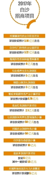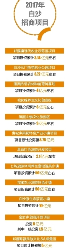 白沙招商瞄准全域旅游、特色产业小镇、美丽乡村、热带高效农业、电商物流园等行业,开展招商引资。