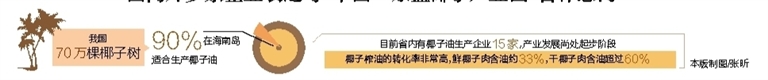 椰子油作为一种高端油品,是世界四大食用木本油脂之一。海南是我国唯一能大面积种植椰子树、商业化生产椰子油的地区。目前省内有椰子油生产企业15家,产业发展尚处起步阶段。